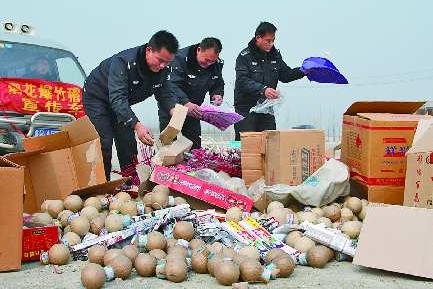 2月16日,菏泽市公安局牡丹分局治安大队民警联合安监、工商、质检等部门工作人员组成联合执法队,对解放北街一销售烟花爆竹的门市部进行检查时,发现违禁礼花弹2124枚,执法人员依法将其收缴,并在万福河滩一空闲地域销毁。 黄体军 吕兆如 摄