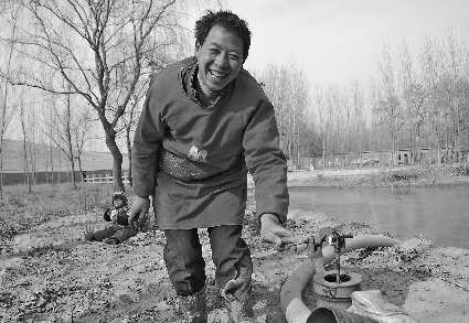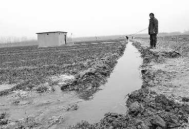 12日中午2点多钟,我们驱车到100公里以外的梁山县。初春时节的黄河岸边气温很低,即使穿着羽绒服也抵不住寒风的凛冽。在与黄河主河道仅一堤之隔的麦田里,村民陈广荷正忙着给自家的4亩地浇着返青水,此时,距离国那里引黄闸开闸的时间仅有半天。