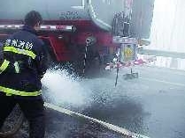 14日凌晨,消防官兵正在紧急抢险。由于13日下雪路滑,4辆大型汽车当日在齐河县济聊高速公路上追尾。其中一辆罐车车体破裂,罐内丙酮泄漏。经过紧急救援,现场险情也很快被排除。