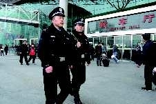 17日,在潍坊火车站,派出所的民警正在执勤巡逻。随着“艺考”开始、“两会”临近,为了维护良好的社会治安秩序,火车站派出所安排民警,在火车站广场开展24小时武装徒步巡逻。目前重点巡逻区域包括火车站和中百大厦周边地区,每次巡逻共6名警力,巡逻将持续到3月份。 本报记者 孙国祥 摄影报道