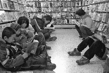 市百货大楼三楼的图书音像区一群小学生正席地而坐在看书。商场工作人员介绍,临近开学,前来看书买书的学生特别多,各类教辅参考书和漫画书受到学生们的青睐。