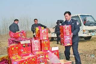 2月15日下午,岚山分局治安大队民警在碑廓镇绣针河边对收缴的非法烟花爆竹进行集中销毁。从2月14日起,岚山公安分局组织开展了烟花爆竹专项检查活动,对全区烟花爆竹销售点进行网式排查,截止到15日下午,共收缴非法烟花50余件,鞭炮10万余头。
