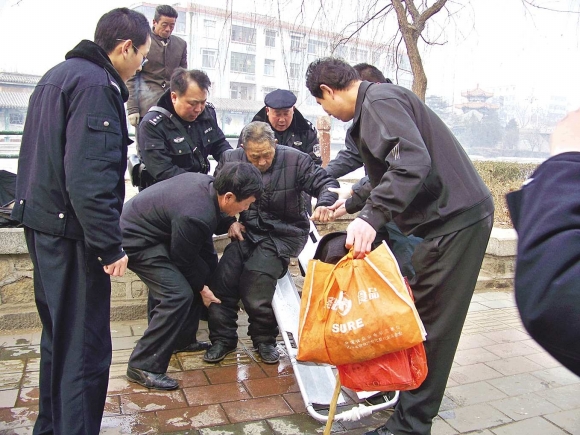杨凤安立刻喊来其他路过的市民帮助,一边报警。“他的棉袄、棉裤浸满了水,我们四个人都拉不动,最后我们抓住了他的拐杖,才将他拉上岸来。”杨凤安说。