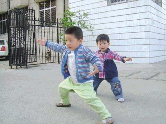 (杨前卫 摄)时间:2010年9月;地点:东湖路河道管理局;自述:两个小朋友在有模有样地练功。点评:后继有人。(奖金20元)