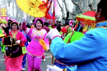 17日上午,在福山区举办的2011年迎新春文艺游行活动上,彩车、扭秧歌、踩高跷、划旱船等各种传统民间表演纷纷登场。本报记者侯文强通讯员 丛纪伟 摄