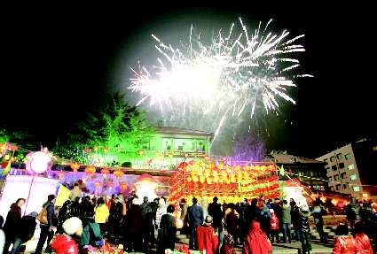 节日夜晚,在烟台山景区,市民正在观看焰火表演。