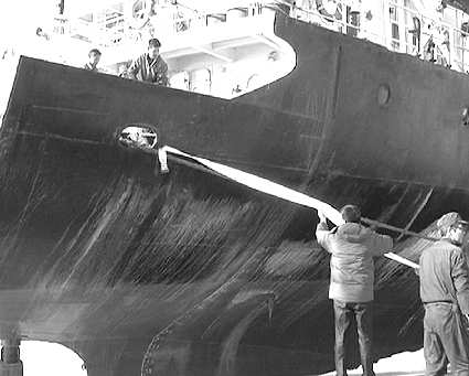 2月17日上午,王守涛和船员们高兴地在船下欢迎牟平消防大队的消防车,大家就像看到了救星。几位船员和消防队员一起将水枪拖上船,随后绑好,白花花的淡水流入船上的淡水储存处,船员们都笑了。船上的做饭师傅更是早早搬出了水桶和水盆,装满了水后开始忙着清洗菠菜。他说,由于淡水不足,他做饭用水时省而又省,费水的菜只好不做。
