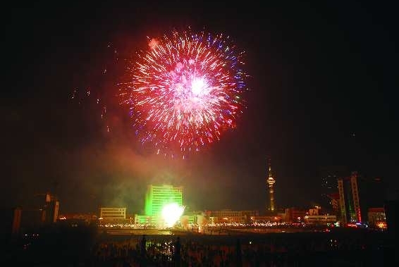 4.17日晚7时许,胜利广场上空燃放的烟花也引来万余市民观看。