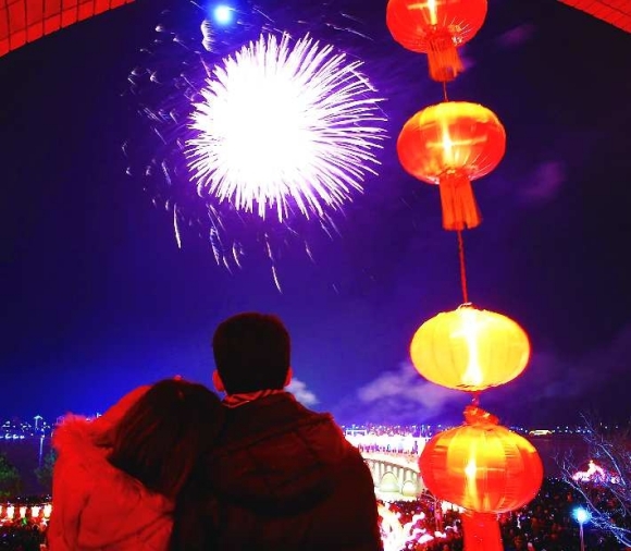 5.一对情侣正在清风湖岸观看燃放的烟花。