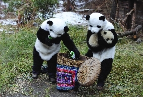 ▲20日,四川卧龙,穿着大熊猫服装的工作人员正在将半岁的大熊猫“淘淘”放入背篓,准备送入野化训练场。“淘淘”是全球首只在野化培训场出生的大熊猫幼崽,它将和妈妈一起“转移”,开始第二阶段野化培训。 新华社发