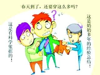 儿童烟台毓璜顶医院小儿内科副主任医师蔡维艳说:“如果过早地给孩子脱掉棉衣或穿得太少,一旦遇到气温下降,孩子就难以适应,外出遭受冷风刺激,张开的毛孔会马上收缩闭合,体温调节失灵,体内热量散发不出去而造成上火,导致身体抵抗力下降,容易患伤风感冒、急性扁桃体炎、支气管炎、肺炎等疾病。尤其是婴幼儿,更要捂一下,但对于喜欢到处活动的孩子,适当减一些衣服,以防玩得大汗淋漓后被风吹,反而会感冒。初春,孩子可以穿得比冬季少一些,家长也要注意天气变化,多提醒孩子。”