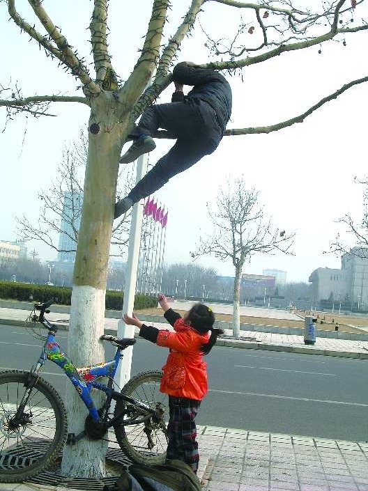 老人见树上的彩灯被摘得差不多了,才小心翼翼地用双手拉住一根粗树枝,双脚沿着树干往下滑,到离地面约50厘米时,手一松,从树上跳了下来。此时,老人并没有罢休,而是向旁边一位妇女借来自行车,踩着自行车又爬到了另一棵树上继续采摘。老人爬树时,孩子站在树下,一边昂头望着老人,一边伸起双手,做出保护老人的姿势,生怕老人一不小心掉下来。