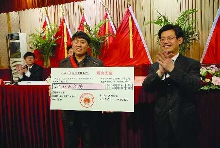 20日下午,济宁市中区召开表彰大会,对获得星光大道2010年度总冠军的“草根明星”刘大成进行表彰,并授予其“运河英才”称号,记三等功,给予10万元奖励。图为济宁市中区区委书记张继民(右)给刘大成(左)颁奖。