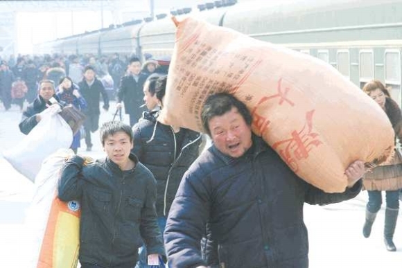元宵节过后,学生开始返校,外出务工者不断增加,聊城火车站迎来节后又一轮客流高峰。19日,共发送旅客6661人次,创今年春运以来客流最高峰。图为:旅客拿着行李奔向车厢。