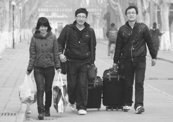 2月21日,全市中小学、各高校正式开学,高校学生已陆续返校报到,原本寂静的校园内外,又出现学生三五成群的身影。图为:19日上午,三名聊大教科院大二学生拿着行李返回学校。
