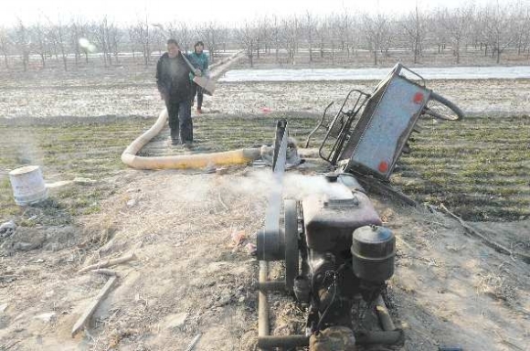 2月19日,开发区东城办事处徐田村村民在浇灌麦田。