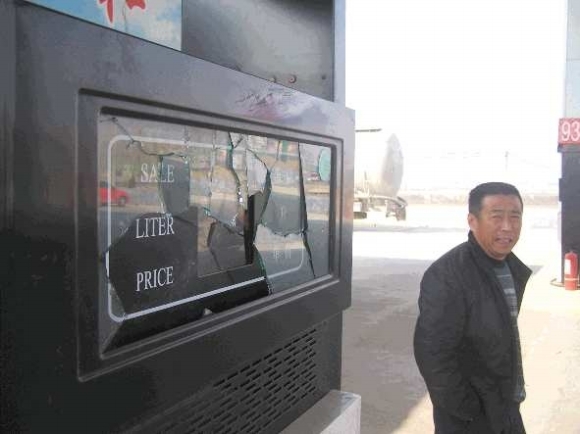 20日上午,记者来到济聊高速聊城西入口处东侧的加油站,不时有车辆进出加油。一台显示93号汽油的加油机有被砸痕迹,加油机上的显示屏玻璃已经破碎无法显示。
