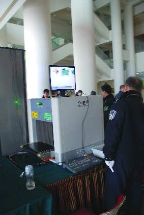 我发现,进入会场,有一条特定的“工作人员通道”,这条通道有一条警戒线,把人大代表和工作人员隔开。在通道内部有一个安检仪,有警察在盯守安检仪器,大会工作人员和服务人员只要带包进入会场,均要接受安检,甚至连水杯也不放过。而在会场内部,也有工作人员在引导代表顺利就座。