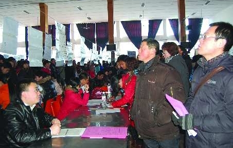 ▲近日在青岛莱西举行的招聘会上,1.1万个就业岗位只招来了1600名工人。十几家莱西外资企业只好“组团”下乡,趁农民出门赶大集买货的机会招工。