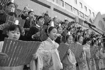 21日,济南解放路第一小学内,开学典礼上,小学生们正在朗诵《劝学》,学校采用朗诵的方式向同学们阐述养成习惯的重要性。