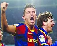 2月20日,巴萨球员比利亚和队友梅西(右)庆祝进球。当日,在2010-2011赛季西班牙足球甲级联赛第24轮中,巴塞罗那队在诺坎普球场主场以2:1力克毕尔巴鄂竞技队。 新华社发