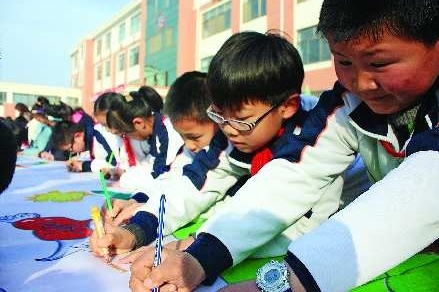 21日上午,开学第一天,田村小学全校师生集结在操场上,在一条百米长卷上共同写下新年愿望。