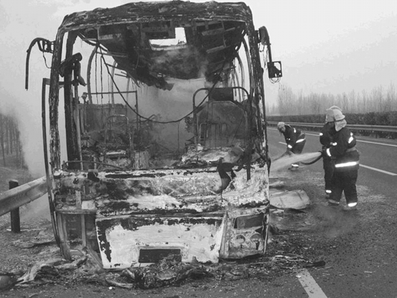 2月19日5时50分,京沪高速60公里处一辆客车发生自燃。泰安消防官兵到达现场后,及时扑灭了大火。由于火灾发现早,人员疏散及时,并无人员被困和伤亡。