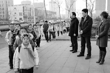 21日上午,三年级七班的同学王天依背着书包来到金海岸小学的大门口,首先遇到的是学校教师在校门口排起的一条长长的队伍,排在最前面的是金海岸小学的副校长赵庆英。“同学,新年好!”赵庆英微笑着向王天依打了个招呼。在赵庆英身后,一共排了36名教师,他们整齐地排在校门口北侧。