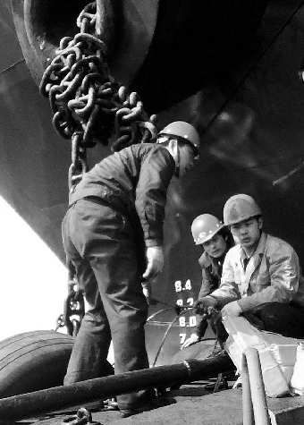 右图:20日,“日港拖3”轮的工作人员正在处理“海福18”轮锚链绞缠事故。