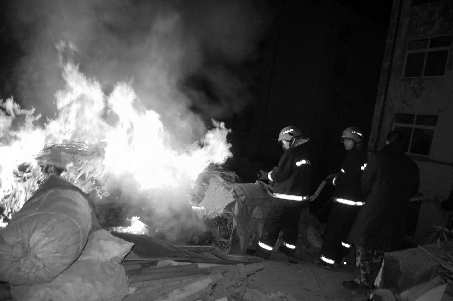 2月21日凌晨,市区一小区居民楼前的储藏室屋顶杂物堆起火,消防人员正在紧急灭火。近期天气干燥,消防部门提醒,居民要及时清理住宅周围可燃物品,注意用火用电安全,防止发生火灾事故。