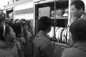 2月21日,小学生开学首日,百余名学生第一课便来到五莲县消防大队学习消防知识,学生们还参观了战士宿舍、车辆器材装备等。图为,消防官兵在教学生认识消防器材。本报见习记者 徐艳 通讯员 王绍丽 摄影报道