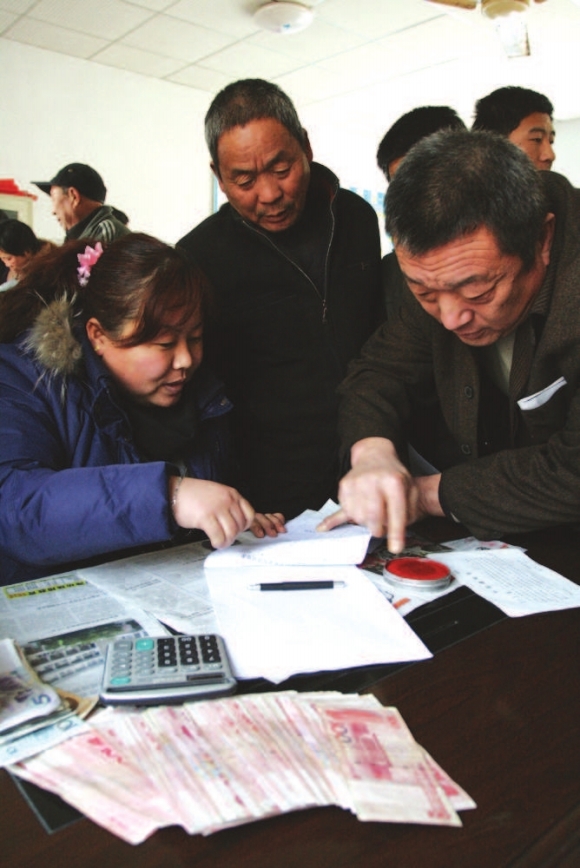 21日,在潍坊市奎文经济开发区南苑社区孙吕家居委会,村民正在领取自己的抗旱补贴。由于长期没有有效降水,耕地缺水严重,为了保证今年的小麦生长,奎文区对村民进行抗旱补贴,每亩地补贴30元。 本报记者 孙国祥 摄影报道