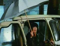 依照路透社描述,画面中的卡扎菲,侧倚着一辆汽车,手中撑着一把雨伞。