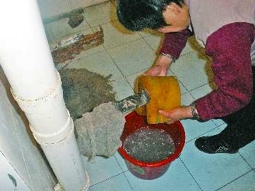 三楼居民告诉记者,现在家里必须每天都有人,随时用海绵将厨房里的水吸到水桶里,否则水就会流得到处都是。“我们每天都能从厨房里用海绵吸出近10桶水,累得腰酸背疼。”该居民表示。