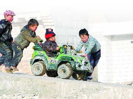 在学校崭新的教学楼前,几名小男孩推着一辆儿童电动车快乐地嬉闹,几名女孩在旁边的空地上正做着游戏。一切都是那么快乐与和谐。