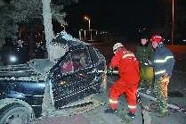 21日22时30分,在五莲县沿河路汽车站附近一辆桑塔纳撞向路边的树后,整辆车被撞扁,司机被困车中不省人事。消防官兵通过破拆将被困司机救出。截至22日下午五点,被困司机由于头部受伤严重,还在昏迷当中。