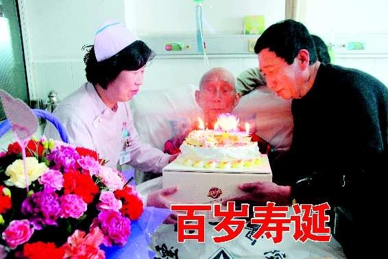22日,家住芝罘区建昌南街的张东山老人在烟台山医院病房度过了自己的百岁生日。鲜花、蛋糕,儿女和医护人员在身边唱起生日歌,曾经心衰三次被从死亡线上抢救下来的张东山咧开嘴笑了,他伸出手有些颤抖的比划着告诉儿女:“今天真高兴。”