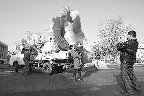 22日,在烟台市文化中心广场,园林处的工作人员正在加紧拆除花灯,不少市民带着孩子在一些已经装上车或者正在拆除的花灯前停下脚步,拿出相机,留下花灯运走前的最后纪念。本报记者赵金阳 摄