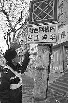 22日,在烟台市区文化路、环山路上几处网状禁停区前又增设了新的交通标志。据交警一大队的王警官介绍说,这是网状禁停区禁止停车的辅助警告标志,主要是为了提醒广大驾驶员切勿在网状禁停区内停车。记者 张琪 通讯员 亚林 全福摄