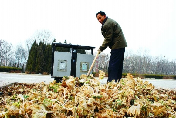 2月22日上午11时许,在胜利大街,市政工作人员正在清理路边的甘蓝。一位市民也过来帮忙,准备将甘蓝带回家喂养小兔子,这些甘蓝伴随着市民度过了寒冬之后即将退出舞台,这里将栽上新的花卉。 本报见习记者 任小杰 摄影报道