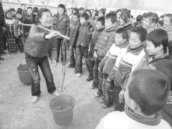 21日,开发区许营中心小学上节水课,老师用发生在身边的旱灾,教育孩子要节约用水。图为:学生体验挑水。