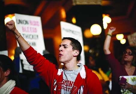 本报讯 据英国广播公司2月22日报道,美国威斯康星州抗议限制工会权利提案的活动已经进入第二周,并正向面临类似提案的俄亥俄州和印第安纳州蔓延。共和党领导的州政府表示,提交工会法修正提案是为了平衡州政府财政预算的巨额赤字。但倾向民主党的工会称,政府以赤字为借口想削弱工会集体谈判的权利。