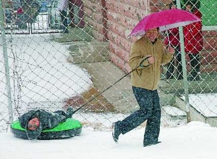 自述:儿子惬意地躺在滑雪圈上,父亲一手拿伞一手吃力地拉着孩子玩耍。