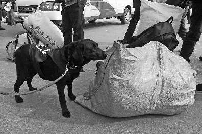 多次搜出乘客携带的违禁物品。图为“小黑”正在仔细检查乘客的包裹。