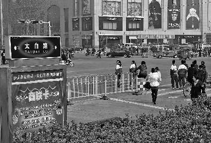 阜桥口“太白楼路”指示牌误标为“太白路”。 本报记者 刘守善 摄