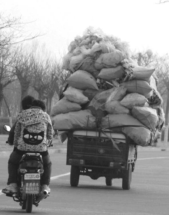 23日,记者在湖滨路上看到,一辆摩托三轮车载着比车身还大的货物在路上行驶,整个车身晃得很厉害,随时都有翻车的可能。 本报记者 邹俊美 摄影报道