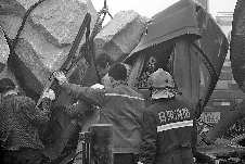 7时,三台吊车相继到达事故现场。为了确保起吊过程中不发生意外,消防指挥员、交警和吊车司机对现场情况进行了查看分析,决定再调动一台大型挖掘机,在起吊时顶住巨石,消防官兵还给被困司机戴上了头盔,保证不让其受到二次伤害,同时在现场布置了两支开花水枪,应对意外火情的发生。
