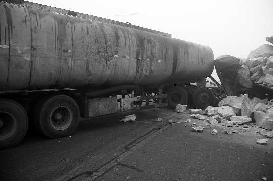本报2月23日热线消息(见习记者 徐艳 通讯员 王程 赵庆平) 23日6时30分,在岚山区沿海公路虎山镇路段,由于大雾,一辆装着40吨原油的槽车与一辆满载巨石的工程车相撞,槽车车头被巨石砸扁,所幸司机无碍。