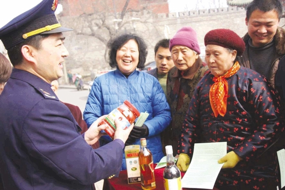23日上午10点钟,泰安市工商局泰山分局的工作人员刚在社区居委会门口挂上“消费维权进社区”的条幅,岱西社区80岁的居民张向荣就拿着一根红色的腰带颤巍巍地走了过来。“我要投诉,你们看看这条腰带,花了那么多钱,用了不到10天就断了,这条都是第3条了。”张向荣向工商人员投诉。记者看到他手里拿着的皮带表面已经严重开裂,从裂缝里露出的材料类似于纸。