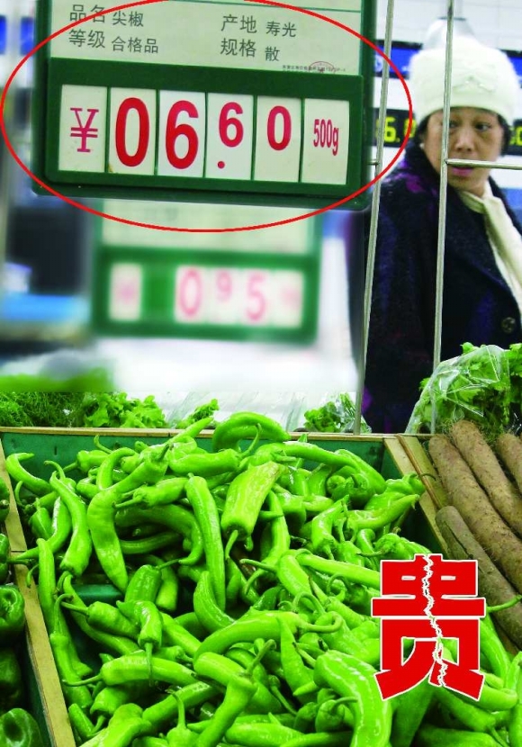 23日下午4时许,记者在东三路的一家商场内看到,尖椒卖到了6.6元钱一斤。 本报见习记者 张大宁 摄详见C03 民生